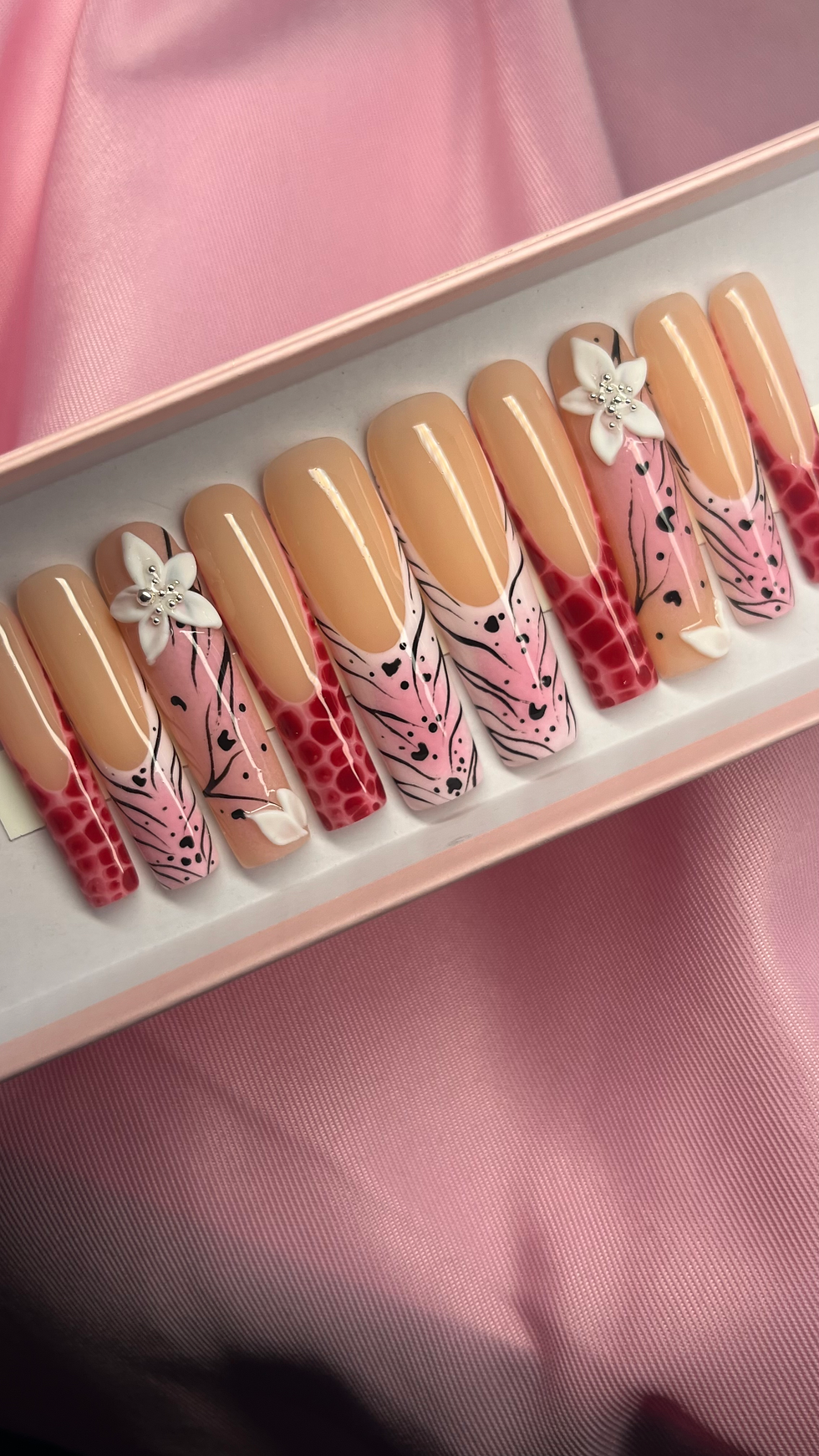 Our beautiful Arlena press ons are a long square press ons that have a glossy nude base, black French tips, and vintage silver cross nail charms with bat charm!